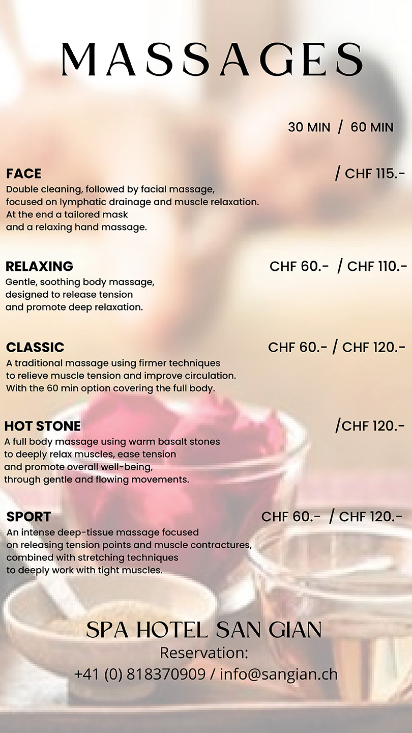 Turn your stay at the Hotel San Gian into a real wellness experience with one of our exclusive massages.